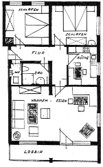 Die Wohnung ist ausgestattet mit einem großen Wohnzimmer, zwei Schlafzimmern,  eines